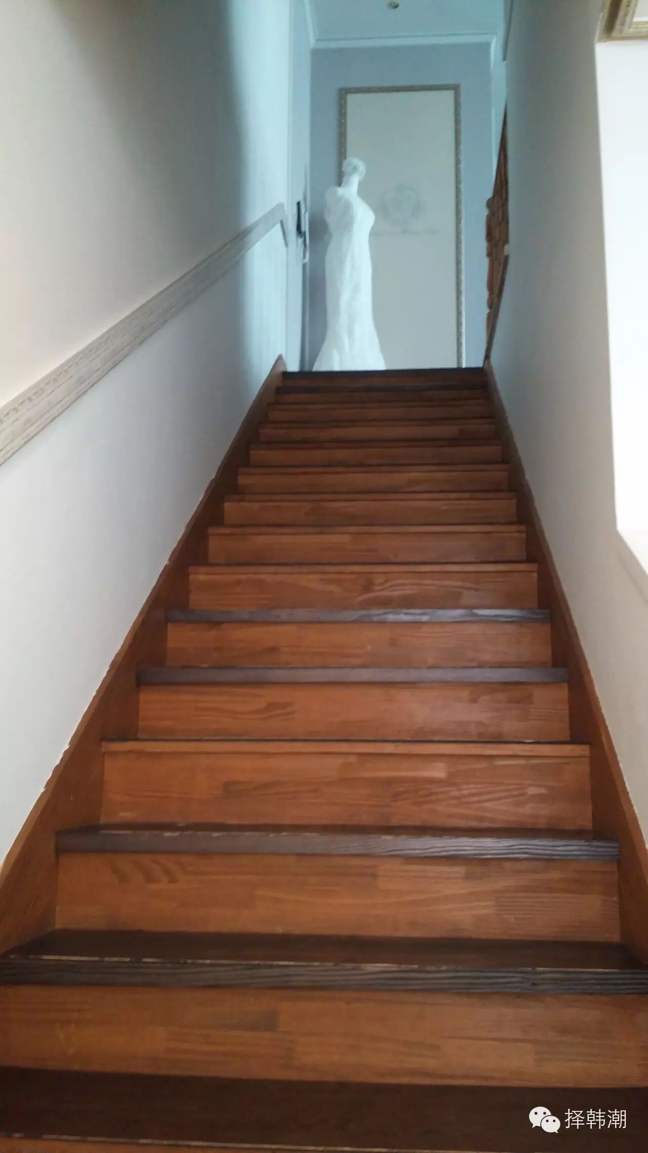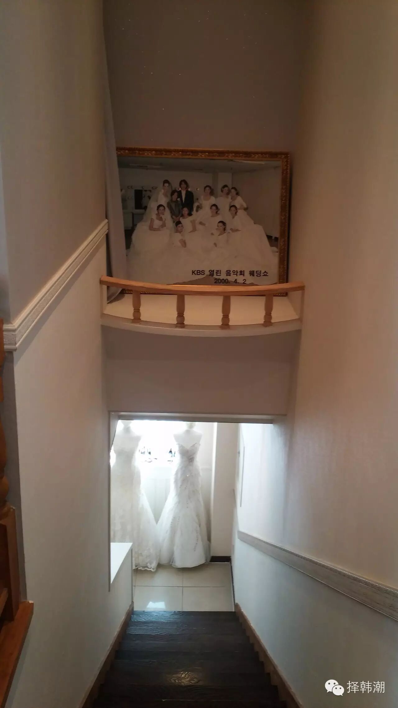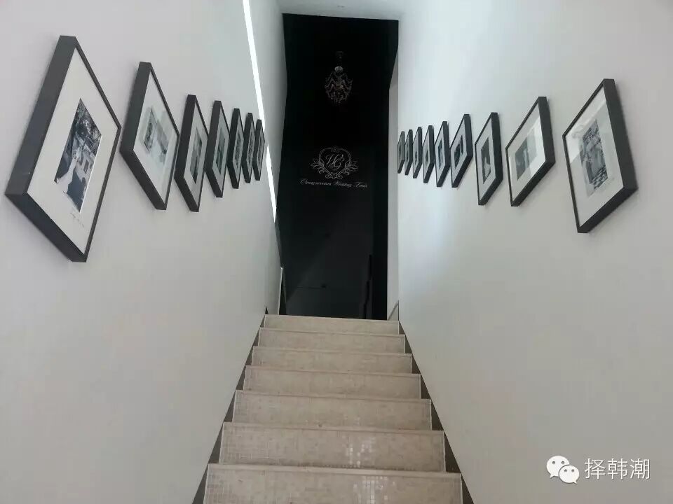 往上是楼梯,墙上有各种名流的婚纱摄影照,